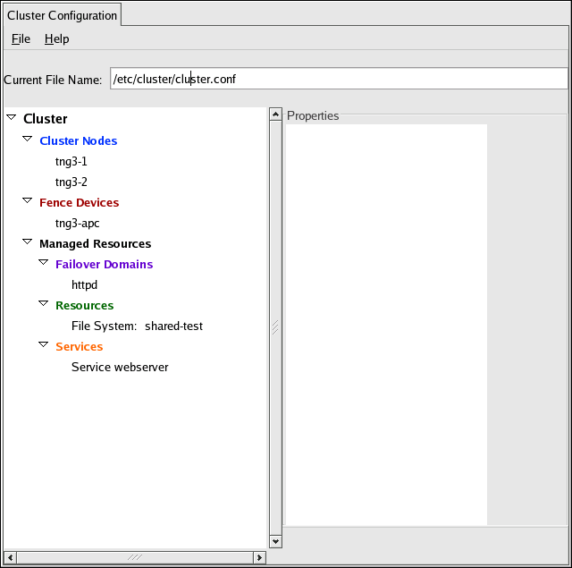 The Cluster Configuration Tool uses a hierarchical structure to show relationships between components in the cluster configuration. A triangular icon to the left of a component name indicates that the component has resources configured. To expand or collapse the portion of the tree below a component, click the triangle icon.